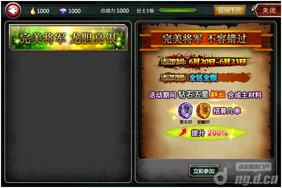 活动内容:砖石五星卡“赵云”合成主材料——觉醒印,招募几率提高至200%