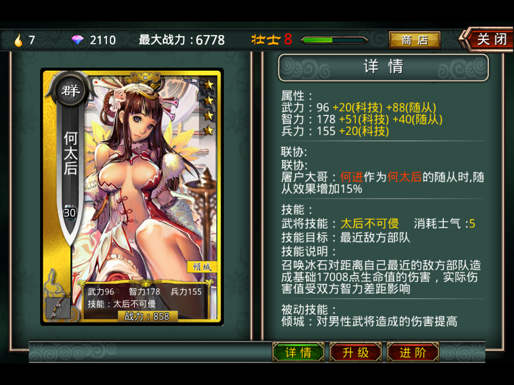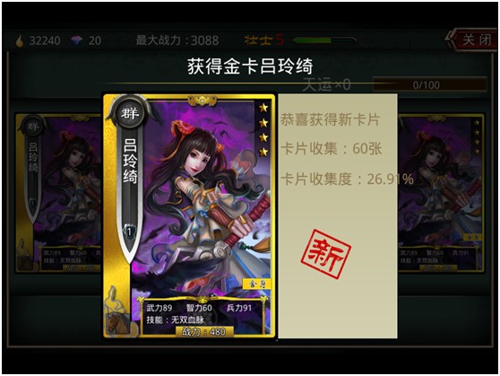亲你要信我的啊,我可是凌晨4点爬起来抽的啊抽了一张如此流鼻血的金卡——何太后,oh……我先擦擦血。咳咳跑题了,之所以不是特别需要金卡是因为金 卡升真·金卡还需要另外3张,对于我这种小吊玩家来讲短期内收集如此多的金卡不太现实,再加上真·银卡和鬼·银卡中期即可打造,经济实惠,故首选,有一两 张普通金卡来养养眼就好啦。