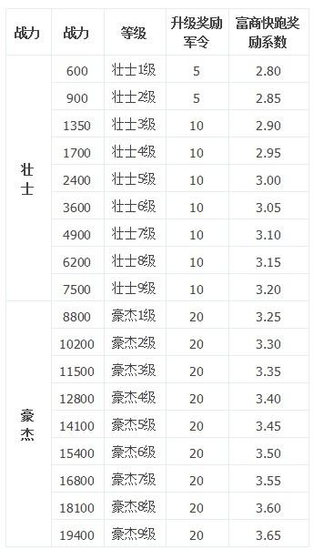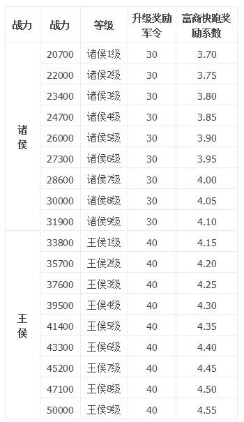 《啪啪三国》四等级对应富商快跑奖励系数表