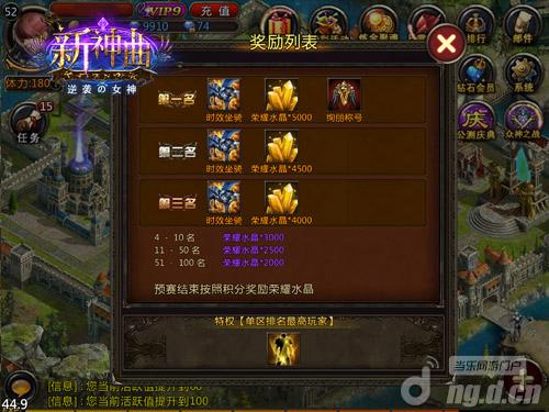 决赛奖励按照名次颁发。玩家将能获得拉风坐骑、酷炫称号、荣耀水晶等珍贵奖励。玩家获得的荣耀水晶,可在荣耀商店内兑换70级传说之石包、焰影卡、高级符文石等珍惜道具。