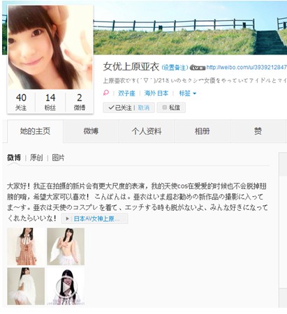昨晚,疑似日本女星上原亚衣的新浪官方微博爆料称,亚衣正在拍一部以国内手游为蓝本的爱情动作片。微博上曝出的试妆照及更衣花絮视频更是尺度颇大,频频挑战微博小秘书底线。