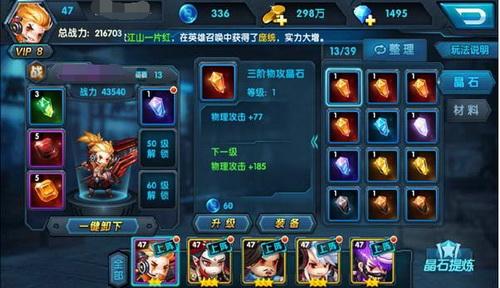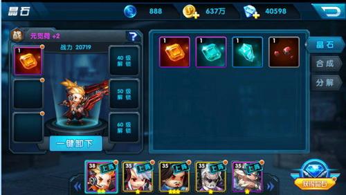 每个英雄不能同时装备相同属性类型的晶石,晶石有品质区分,品质越高,基础属性越高,成长属性越高。