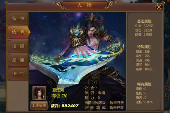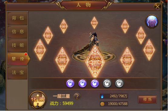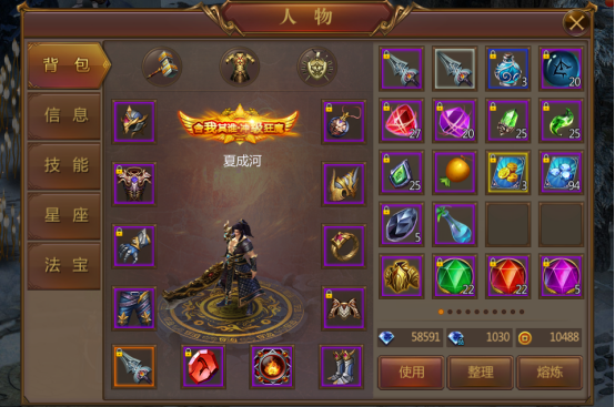 打开主面板,即可看到人物的主要信息,主要分为:背包、信息、技能、秘术、神格、星座。是否觉得眼花缭乱呢?别急,让我们来细细发掘。