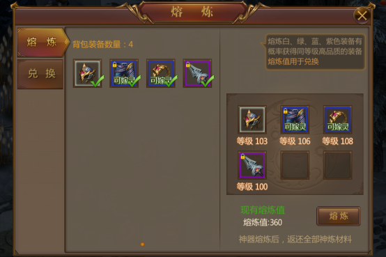 C、熔炼:可打开熔炼面板,将无用的装备熔炼成熔炼值,可用于兑换各种极品道具。熔炼并且有概率可以获得同等级高品质的一件装备。