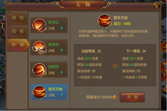 每个角色初始即为1个单体技能+3个群攻技能。我们可以在技能面板,消耗金币对技能进行升级,加强技能的效果及伤害。升级技能还可以增加战斗力哦~