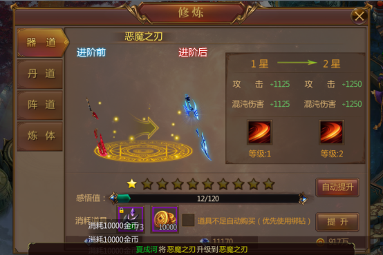 A、器道:对应的为武器,消耗星辰砂跟金币即可提升,增加人物攻击属性。提升满10星后进阶,即可获得不同外形的武器模型!并可以在幻化处自由切换模型哦~