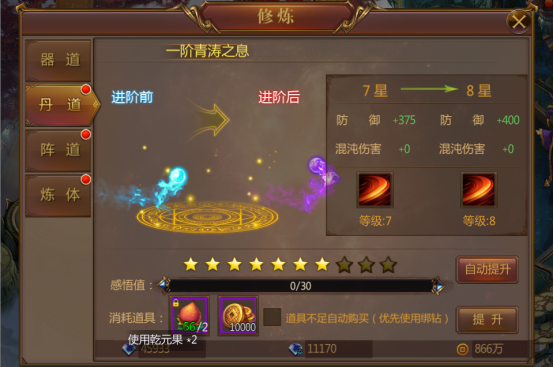 B、丹道:对应的为气息,消耗乾元果跟金币即可提升,增加人物防御属性。提升满10星后进阶,即可获得不同外形的气息模型!并可以在幻化处自由切换模型哦~