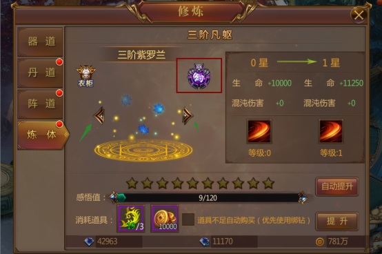 D、炼体:对应的为脚印,消耗升龙兰跟金币即可提升,增加人物生命属性。提升满10星后进阶,即可获得不同外形的脚印模型!并可以在幻化处自由切换模型哦~