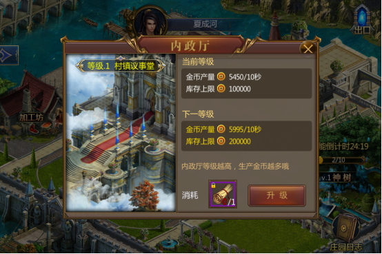 生产金币的地方。内政厅的等级越高,生产金币的效率越高,上限也越高噢~你问我怎么升级?打打世界boss、精英boss会掉落建筑图纸,就可以升级内政厅拉~
