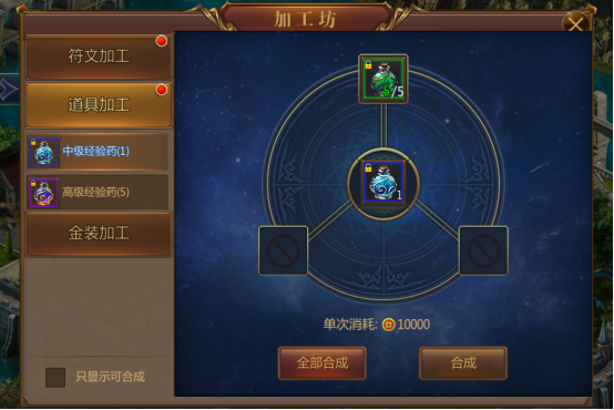 顾名思义,这就是一个加工的地方。在这里你可以合成各种魂石、装备、材料等等~手上多余的低级魂石、经验药、装备材料等等都可以在这里合成更高级、更珍稀的道具。只需要支付小小的金币即可哦~