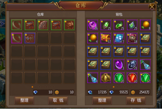 背包不够用了怎么办!把暂时用不上,或者不常用的物品存入仓库就是个很好的选择,即不占背包,又不用丢弃。仓库格子也是跟背包一样,可以花费神晶开启更多的格子。当然,你的金币、绑晶也是可以存进去仓库的。你问我有没有利息?嗯,是没有滴!