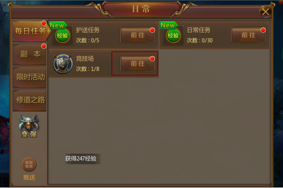 在游戏主界面,点击历练按钮打开日常任务面板,就能看到竞技场,点击前往就能进入竞技场拉~