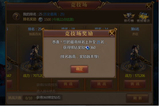 D、根据竞技场排名,每天还可以结算获得排名奖励,排名越靠前结算的越多噢~