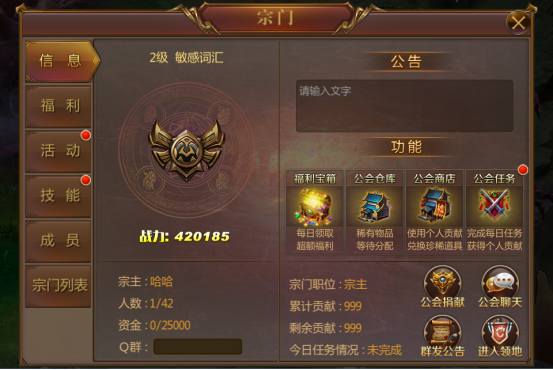 宗门成员:这里可以看到各个成员的信息以及在线情况。