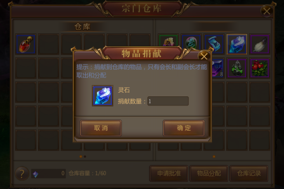 你可以将非绑定的物品捐献给宗门仓库里。捐献之后物品将由宗主和副宗主进行分配、当然其他的玩家也可以申请这些物品。当宗主或副宗主审核通过即可发放。