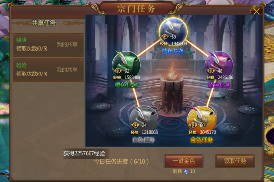 每人每天有10次宗门任务次数,每次任务都会随机接取金色、紫色、蓝色、绿色、白色五个品质的任务。品质越高获得的经验越多。当然也可以通过消耗神晶直接领取金色任务。金色任务可以共享给宗门内的成员,每人每天有五次领取共享任务的次数。完成任务可以获得大额的经验噢~