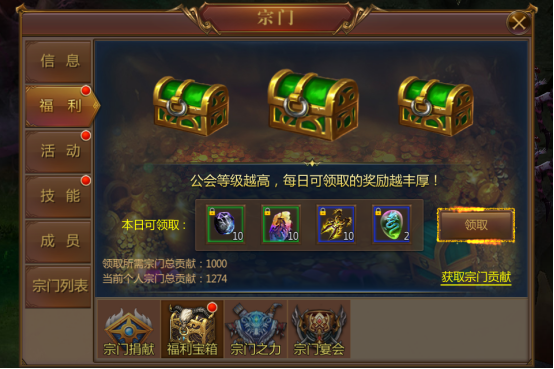 福利宝箱:每天登录即可领取超值公会宝箱一份。随着个人宗门总贡献提升。可以领取的宝箱等级提升。随着公会等级的提升,奖励也会越来越丰富。