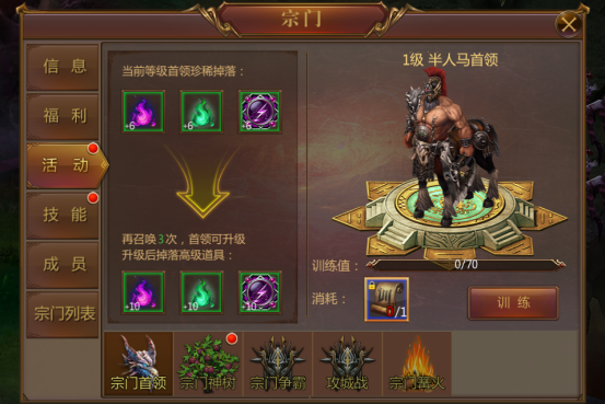 宗门boss:宗门成员通过使用boss训练券训练boss。当训练值满时,既可召唤boss。随着召唤次数增加,boss等级也会增加,可获得的物品也会越珍贵。