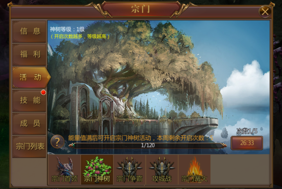 1、宗门成员每天可以给神树充能五次。能量值满后宗主或副宗主可以激活神树。