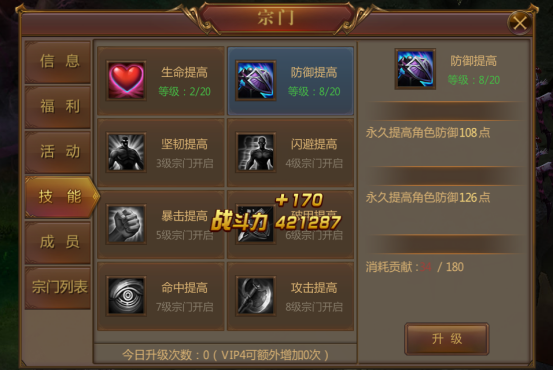 消耗公会贡献值可以升级公会技能。技能直接增加人物属性、战力。随着宗门等级的提升,可以激活的属性也越多。每天每人只能提升10次技能。VIP每天赠送更多的升级次数。