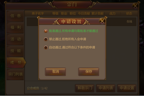 申请设置:可以设置自动加入宗门条件、拒绝任何人加入、审核加入三种模式。