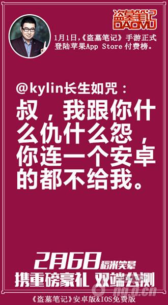 大安卓用户不能忍了,为什么手机游戏都是ios先上线真是够了,安卓党需要关怀!2月6日 天拓游戏《盗墓笔记》双端公测贺岁来袭,安卓版和IOS免费版同步上线,安卓党终于不用伤心,因为我们同步了!而随着游戏公测,各种福利和活动一起火爆来袭,幸福来的真是太突然了,哈哈哈哈......