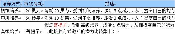 角色通过培养把潜力随机转化为武力,法力,敏捷,体力 四项基础属性,需要角色拥有剩余潜力点数与对应培养方式的消耗品。