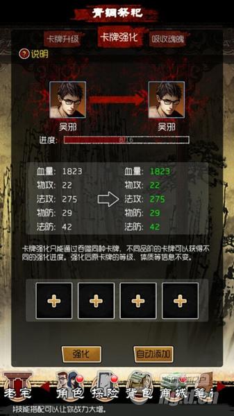 玩家在打开青铜祭祀界面后,点击上方的“卡牌强化”功能,玩家选定目标卡牌后,就可以通过吞噬相同角色的卡牌,让目标卡牌的品阶在现有基础上强化。
