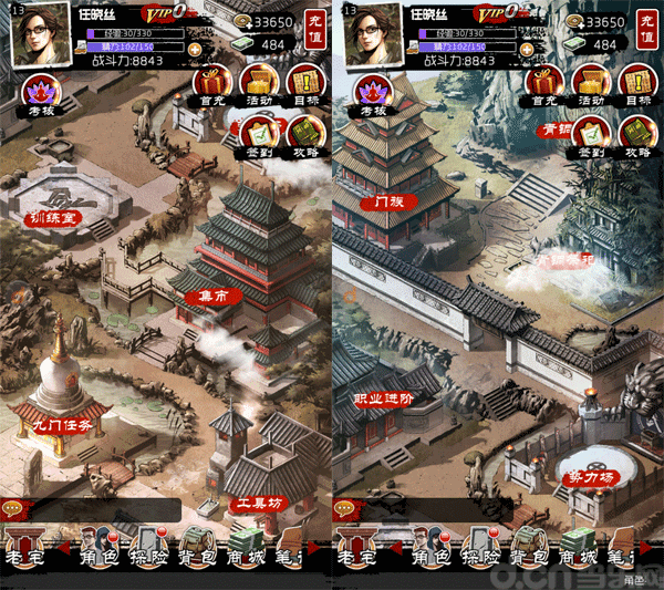 游戏不同于其他卡牌游戏,改编自现代小说的《盗墓笔记》采用的是相对写实的画面风格。游戏主菜单界面是可以上下进行拉伸的,游戏中的众多系统尽在于此,不过不知道厂商是不是偏爱拉伸,下方菜单栏也是可以左右移动的。菜单界面的动态效果十分不错,细致的画面给玩家一种阳光普照,白云漫展的感觉。