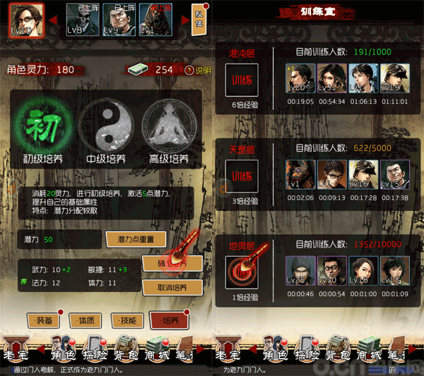 除了剧情副本外,《盗墓笔记》还增添了九门任务系统,也是就是世界boss,玩家可以根据条件需求进行世界boss战斗,获取丰厚的奖励。游戏中玩家可以用铜币在集市系统中购买需求的装备,另外训练系统对玩家的升级也大开便利之门,队员可以边战斗边训练,帮助玩家快速的增强自身战力。