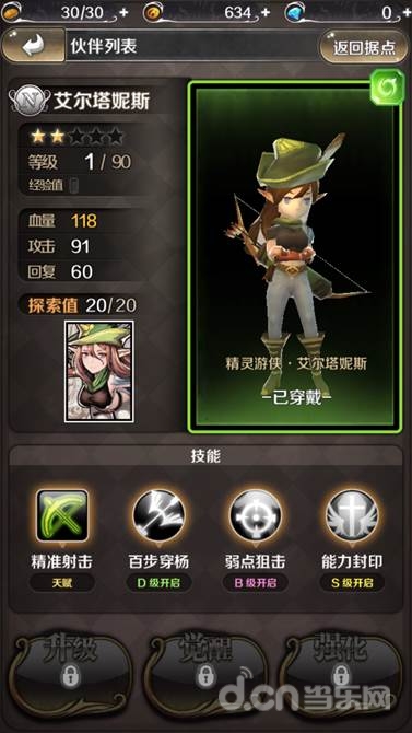 伙伴信息界面会显示伙伴的星级、品质、属性、技能、3D模型、提升伙伴属性的方式及入口。在这里,我们可以对伙伴进行升级、觉醒、强化操作;