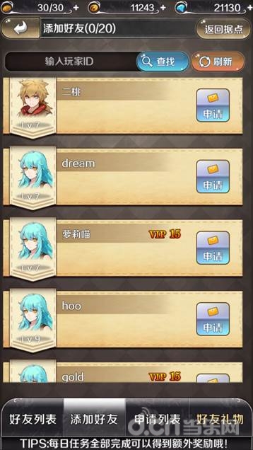 点击进入社交好友系统的推荐界面,当游戏服务器内有非玩家好友时,系统自动推荐,每次显示5名玩家。
