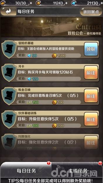 玩家可以通过完成任务来获得大量的经验、金币及少量钻石,任务分为主线任务及每日任务。