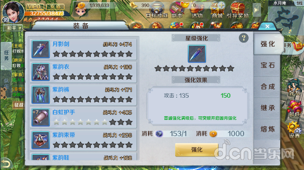 玩家可以通过强化、先前宝石、合成、继承、熔炼等操作对装备进行属性提升。装备强化分为了3个阶段,星级强化、圆月强化和巅峰强化。