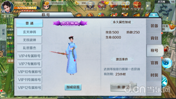 游戏中的称号一种是通过充值VIP获取,不同级别的VIP有不同的称号名称,另一种则是通过游戏内的各种玩法进行获取,包括了等级排行、战力排行、首冲称号等。