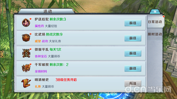 日常活动则是每日随时可以进行挑战的活动,通关后可获得大量经验、礼券、铜币以及材料等。限时活动则是需要在规定的一段时间内进行挑战,错过时间则无法进行