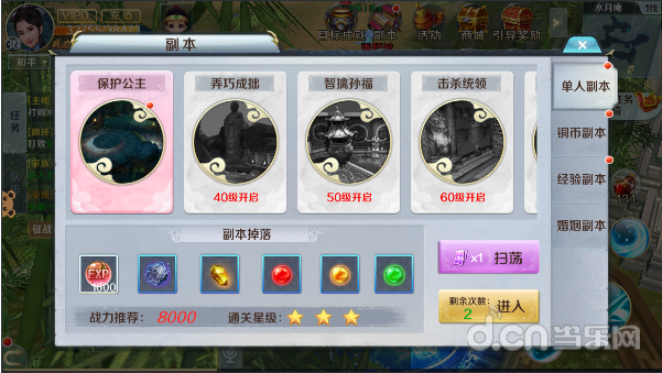 目前游戏共有单人副本、铜币副本、金币副本以及婚姻副本4大类,每个副本每日有一定的挑战数量限制。