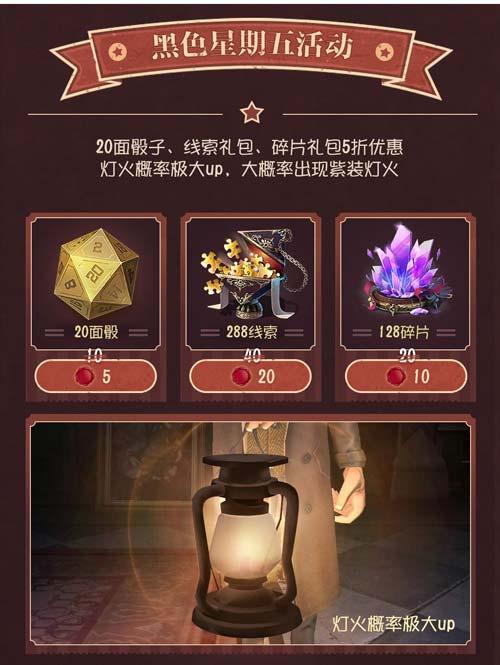 ③ 【黑色星期五】:11月22日维护后至11月25日23点59分59秒期间,20面骰子、288线索礼包、128碎片礼包将开启五折特惠,同时灯火触发概率以及灯火中奇珍时装出现概率将大大提升;