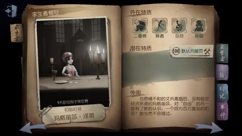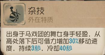杂技:高处落下增加30%移速,适合在有双层建筑的地形溜监管者,例如医院二楼,湖景村的大船,月亮河公园的鬼屋等。
