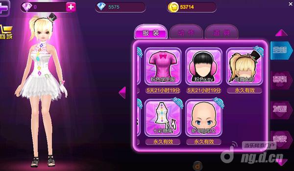 选好角色以后小编的形象是这样的,人物年龄设定看起来也是十几岁的模样,身材比例也不夸张,不过分Q萌也不过分性感,小学生看了也能把持的住。商店里可以选择购买人物服装,舞蹈动作以及经验卡之类的道具,三种货币:蓝钻粉钻和金币。粉钻只能通过充值获得,蓝钻和金币游戏中就可以获得,并不会影响游戏本身的平衡。