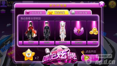 玩家在《唱吧炫舞》的舞蹈体验过程中,有一定几率会出现“宝星”按键,玩家需要在规定的闪烁时间内点击出现的宝星,一旦系统判定点击结果为great或perfect,玩家即可获得该宝星。搜集到的宝星可以用于开奖,点击游戏“欢乐开宝星”功能界面,玩家就可以开启宝星获得包括精品套装、经验、钻石、金币在内的各种物品,奖励多多不可错过哟。