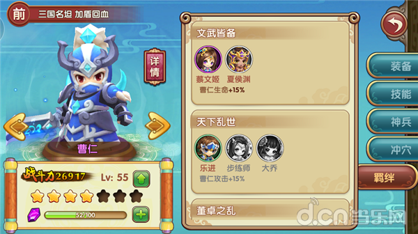培养方向:曹仁作为肉盾,是抗伤害的主力,又自带防御和生命恢复,所以需要全方面培养,因此技能方面一定要跟随等级进度全部点满。主角、赵云和小乔是队伍输出的主力,技能全部都要点满,同时优先在“冲穴”中激活攻击等属性;蔡文姬作为辅助治疗,应优先保障生存,增加冲穴里的生命加成是一方面,还要将辅助技能点满,最后才考虑攻击和减益等技能的升级。
