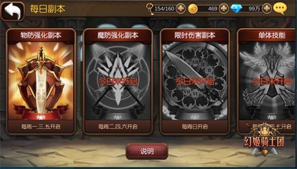 以上也说到各种的强化材料都来自于副本,所以每日副本对玩家来说是尤为重要的系统。每日副本按照每周特定日期开启不同类型的副本。物防强化副本,指的是怪物的物防很高你需要带魔法型输出的英雄前去挑战。魔防强化副本,则与物防强化本相反需要带物理型输出英雄去挑战等!玩家们每天的任务很重哦!