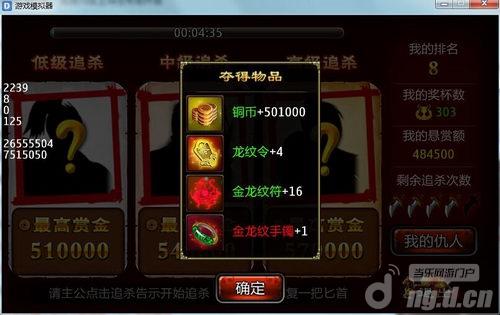 挑战成功者除开增加奖杯,还可获得与对手赏金额相等的铜币奖励,以及随机爆出的物品:饰品、最高级铜币卡、最高级经验卡、淘宝符、洗炼石、升星宝石、最高级卡片碎片、龙纹令、最高级符文(神龙纹符除外)!特别是饰品哦,副本之外拿到饰品的新途径哦!失败方也将有一定的惩罚。因此这是一个收益与风险并存的超刺激PVP系统!