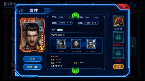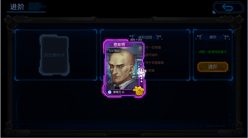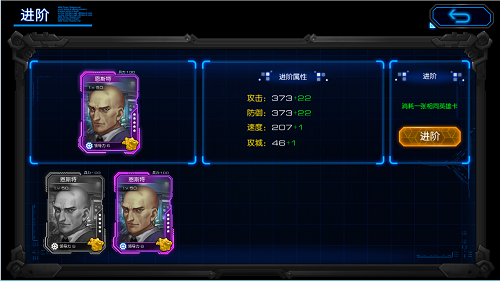 游戏中可通过消耗一张相同的指挥官卡来进阶该指挥官属性,并且1颗星变为金色。如果材料卡为已经进阶过的卡牌,则在增加属性以及金色星星数量按照材料卡对应数量进行累加,超出上限部分不再累加。