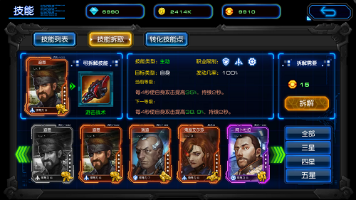 在游戏中,每张将领卡牌拥有一个专属的技能、一个可拆解的技能,同时还可以额外装备2个技能装备槽,玩家通过装备技能可带来很大的能力提升。