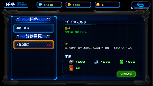 游戏系统为玩家设置了任务与战略目标,引导玩家在游戏前期有规划地去建设自己的领地。通过完成任务不仅可以熟悉游戏玩法,还能获得资源奖励,以及珍贵的钻石奖励,可在主界面左下角点击进入查看。