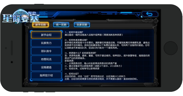 往往新手玩家对于策略游戏是比较头疼的,很容易玩着玩着就不知道该干嘛了,或者不知道资源怎么分配,武将怎么搭配之类的。《星际要塞》在这一点上做的非常用心,新手引导和部分攻略都内置到了游戏内部,玩家无需跳出游戏即可方便的查看。
