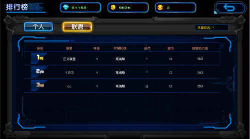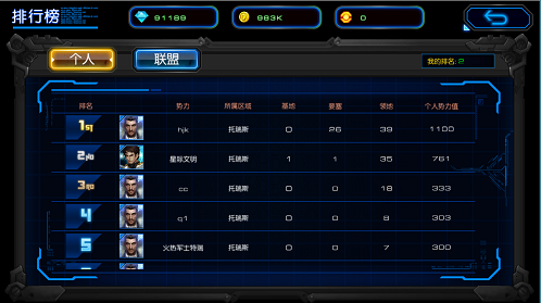 游戏中排行榜分为个人排行和联盟排行,是顶级星际霸主和顶级联盟展示的舞台。
