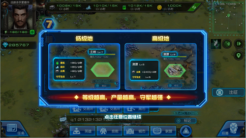 在大世界中的每格土地都是不同等级的资源地。资源地等级分为1~9等级,每种等级的资源地在世界地图中都有特定的标示方便玩家记忆和寻找。等级越高的土地资源产量越高,当然敌人也就越强,建议玩家在兵力达到一定标准后再去挑战高级土地。